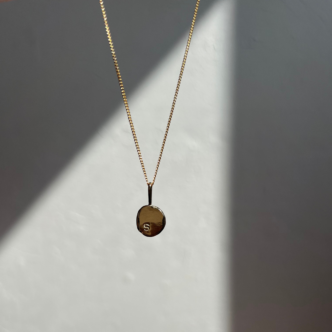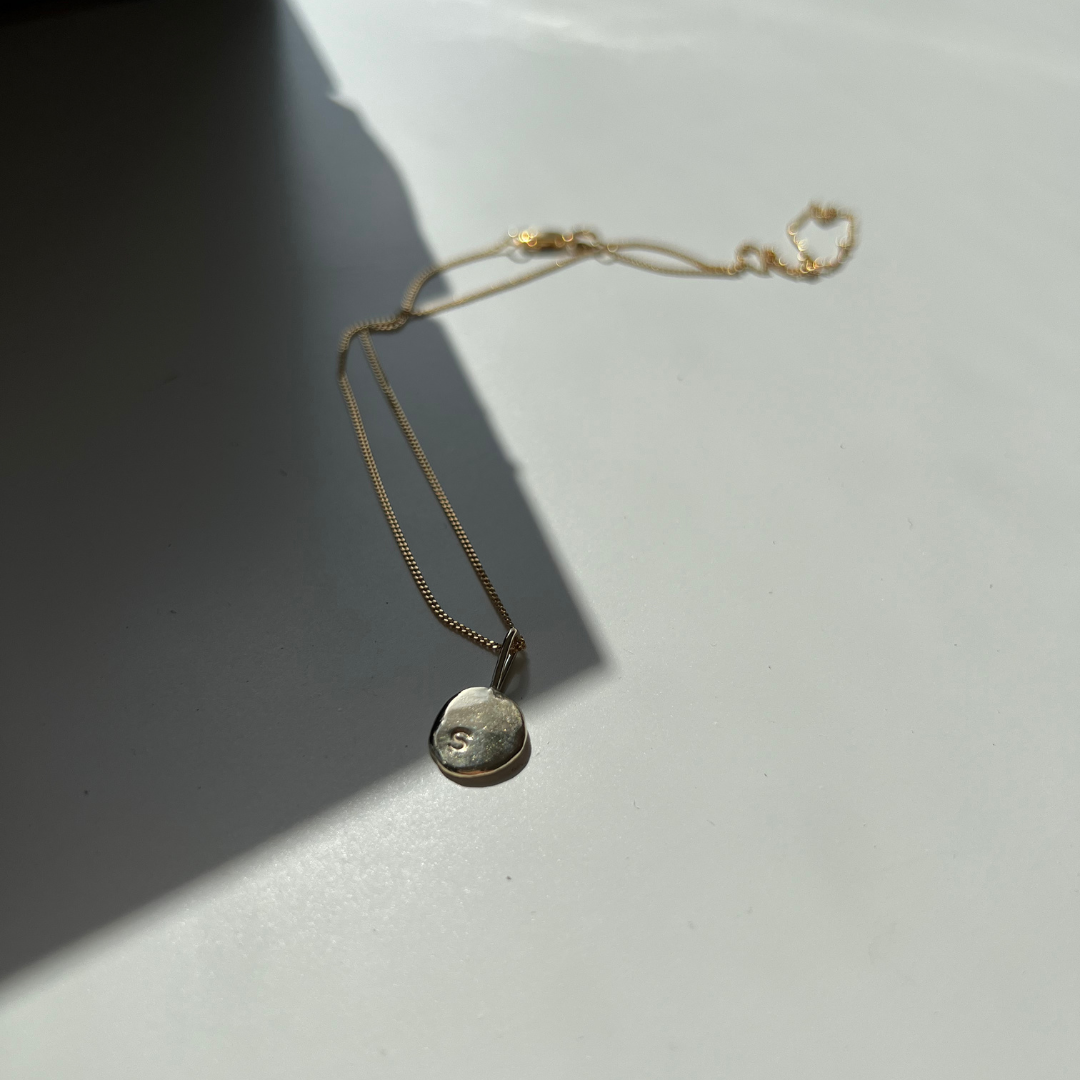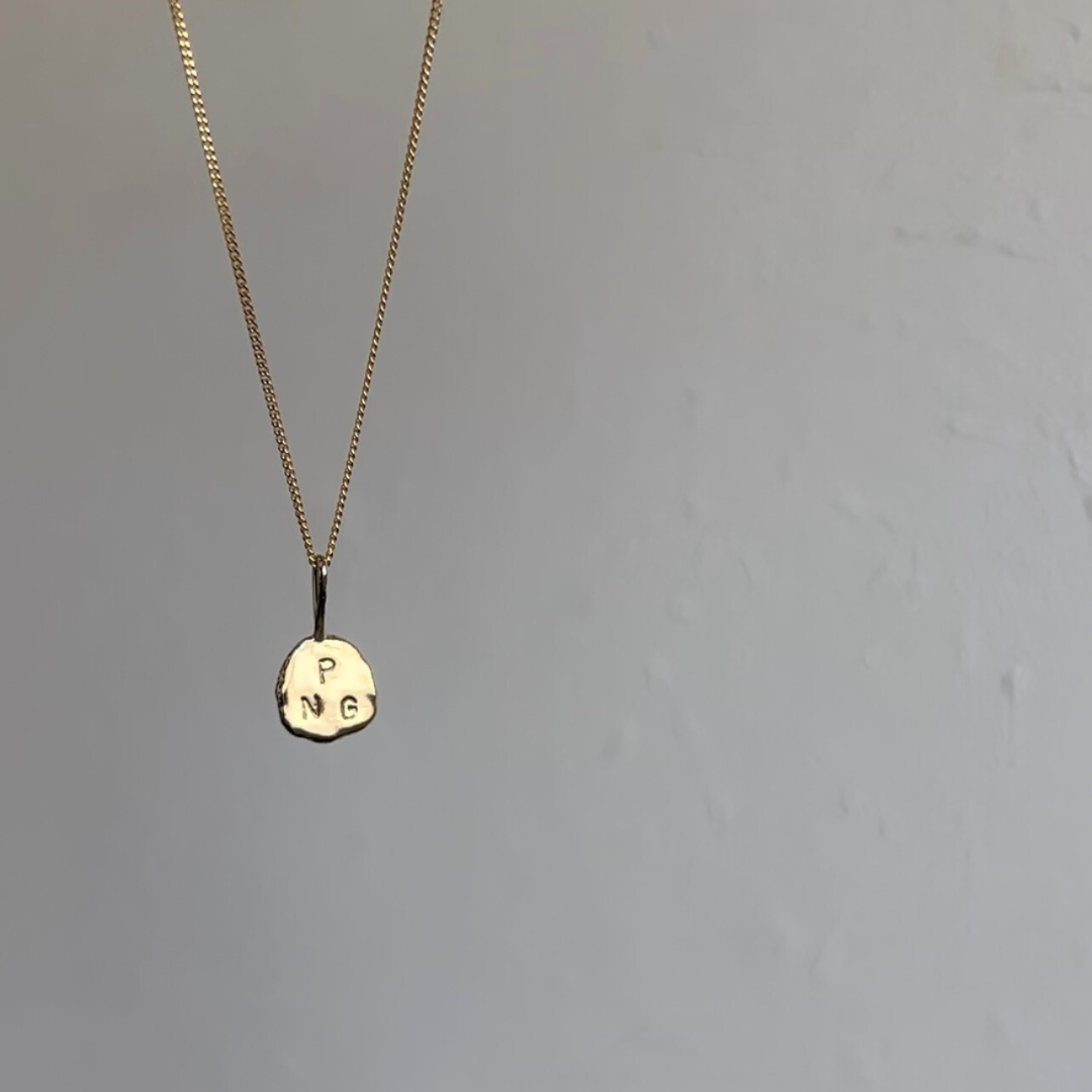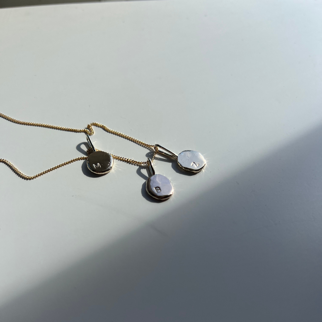 Each Initial Pendant is delicately handmade by melting down recycled Australian 9ct Yellow Gold into an organic, one-of-a-kind shape, then hand stamped with your chosen initials.