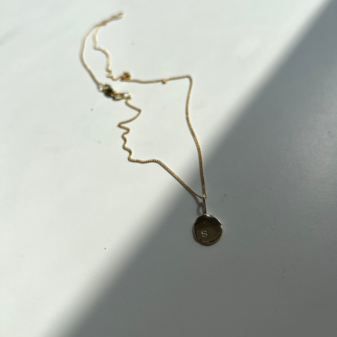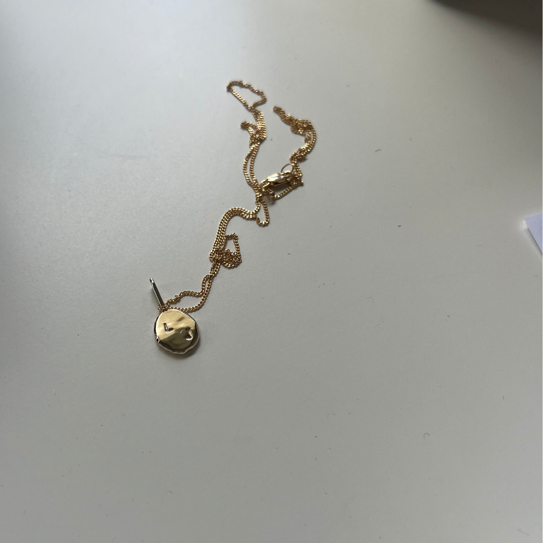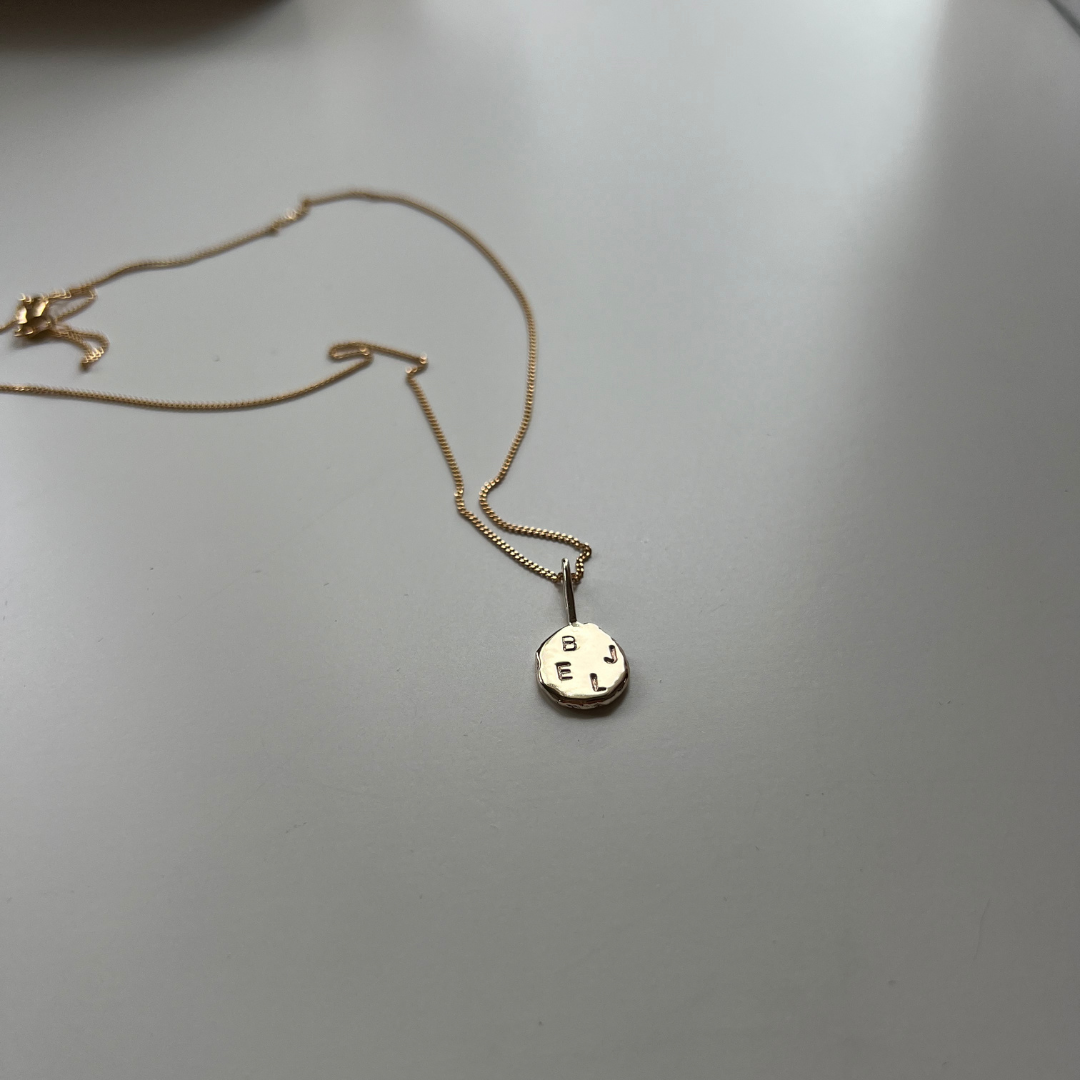 Each Initial Pendant is delicately handmade by melting down recycled Australian 9ct Yellow Gold into an organic, one-of-a-kind shape, then hand stamped with your chosen initials.
