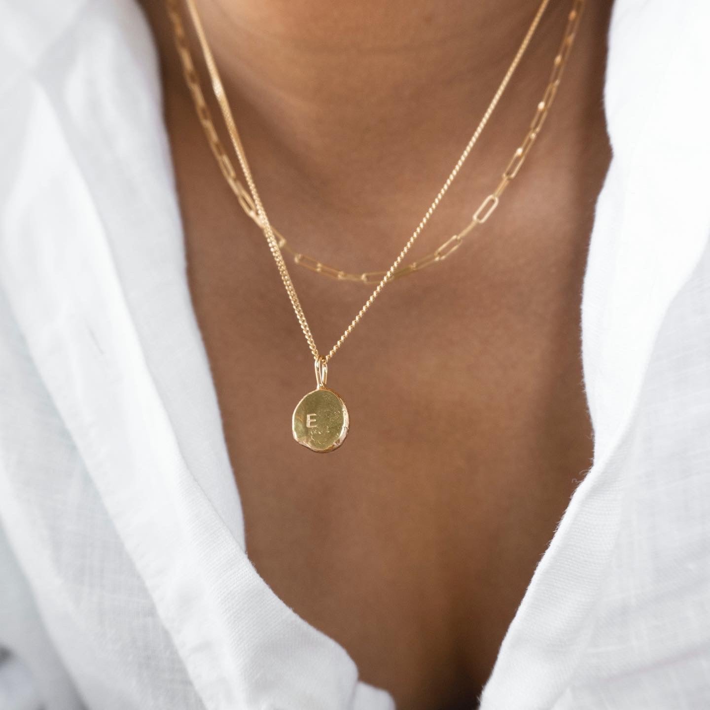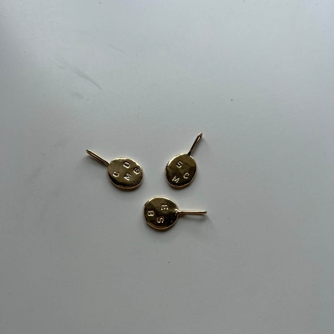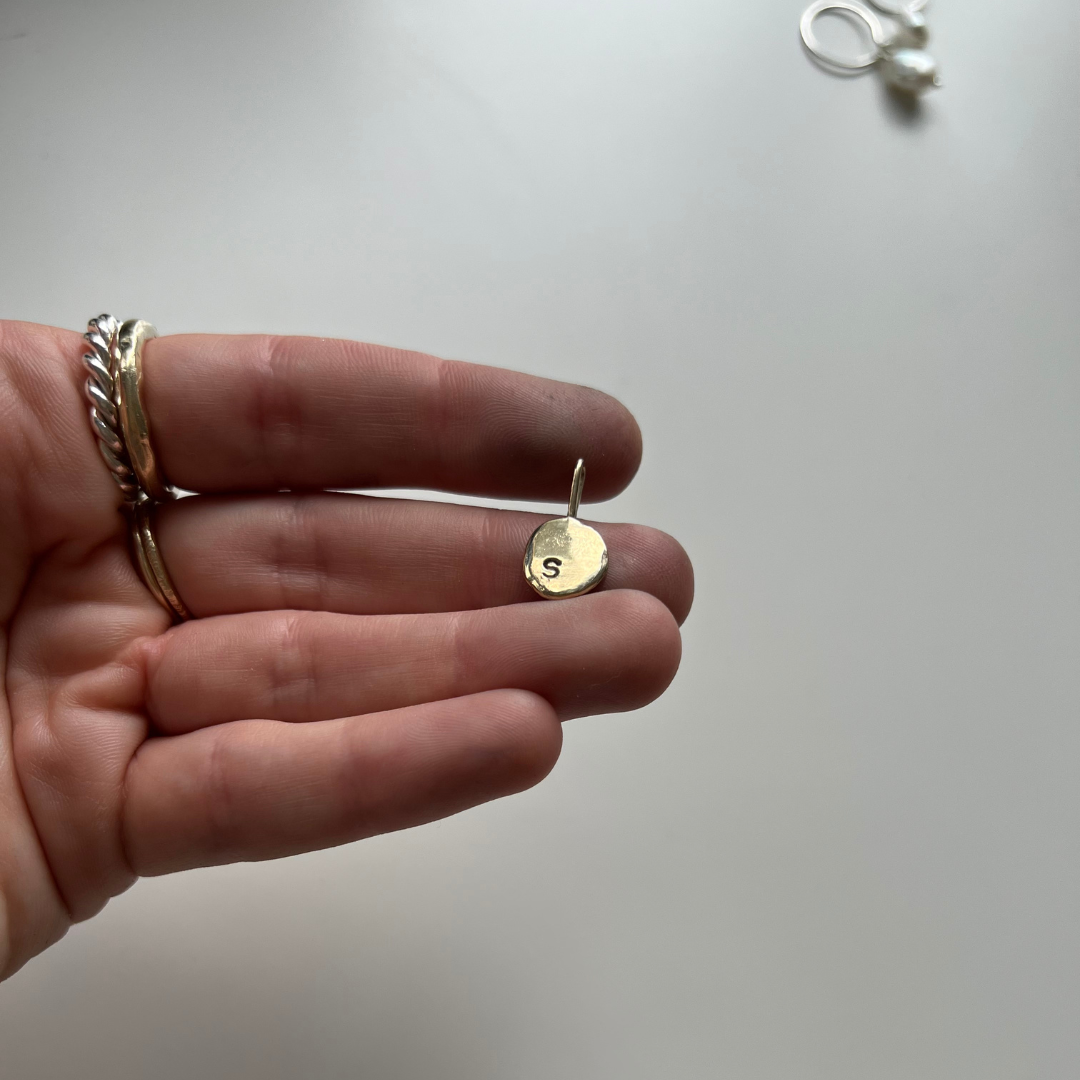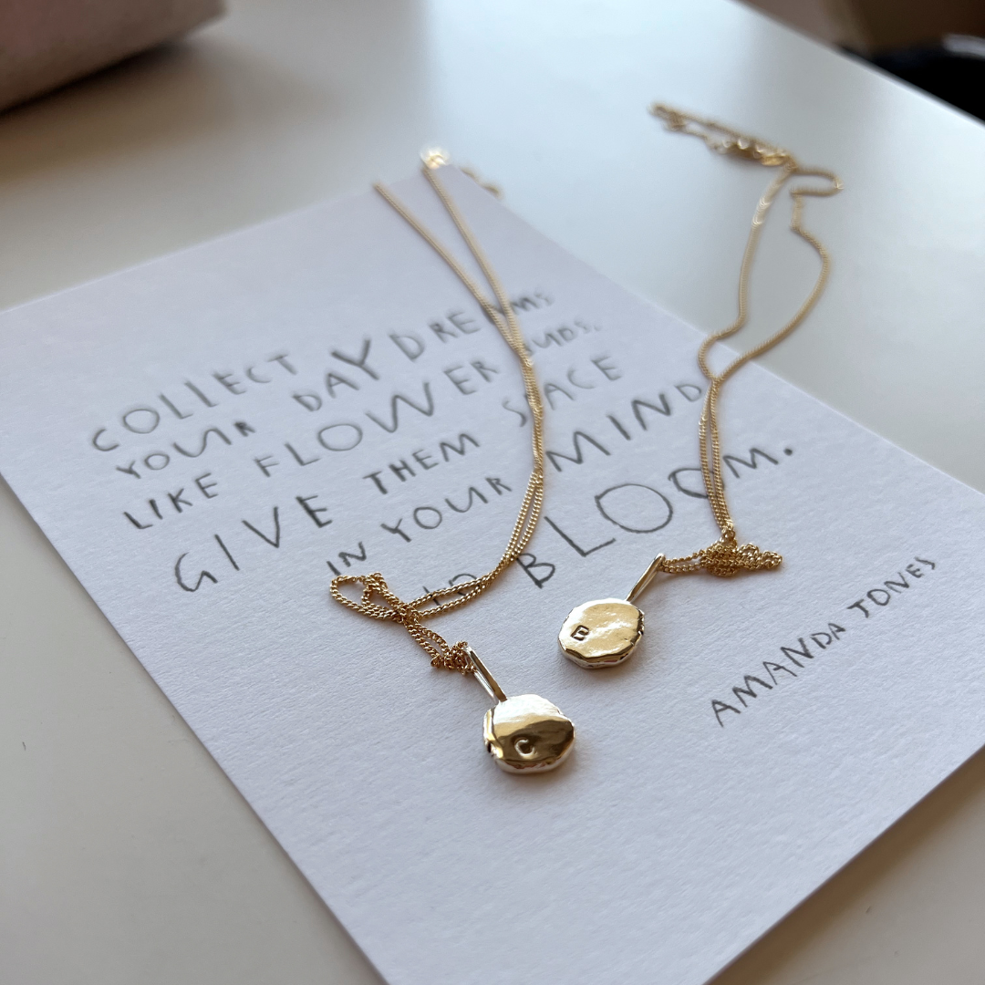 Each Initial Pendant is delicately handmade by melting down recycled Australian 9ct Yellow Gold into an organic, one-of-a-kind shape, then hand stamped with your chosen initials.
